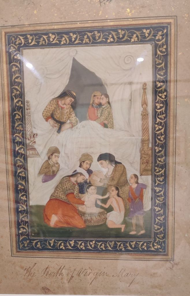Here’s one quick example from the Miniature Paintings gallery, Mughal division. The plaque says “The Nativity” but the writing on the painting says “Birth of Virgin Mary.” From 1720ish.