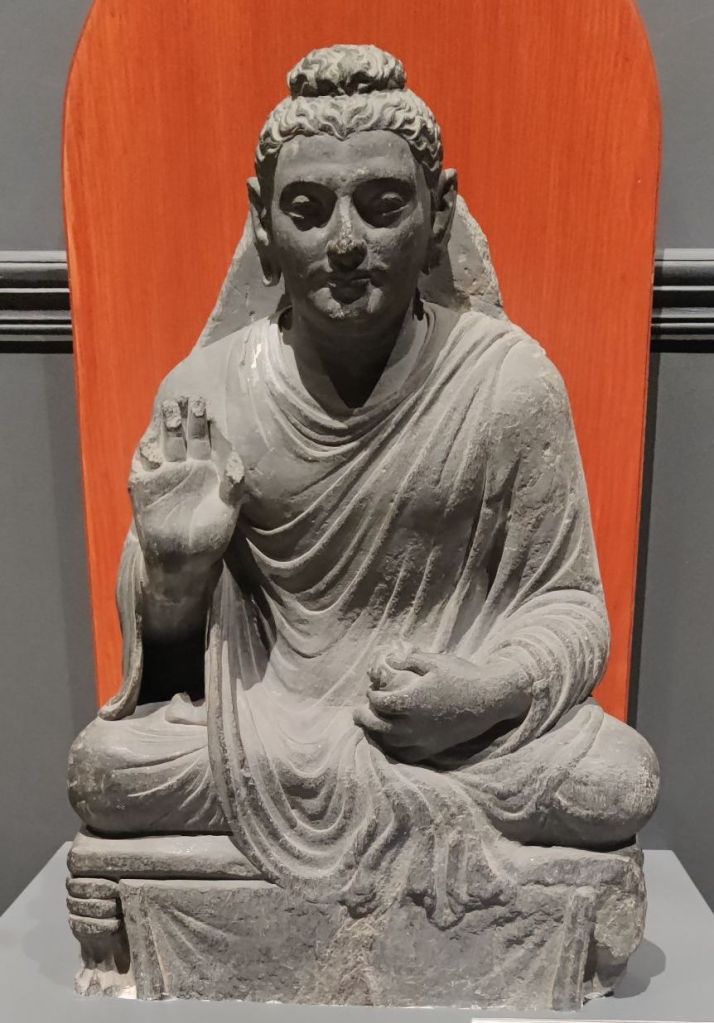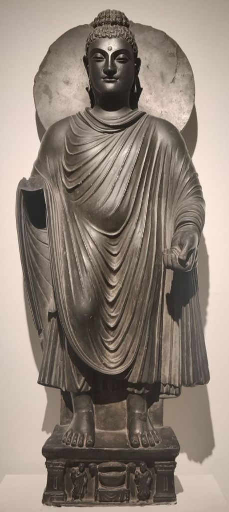 From the same time period is this Standing Buddha from the Gandhara School, which was heavily influenced by Greek art. The standing Buddhas of this era mark the start of depicting Buddha in human form.
