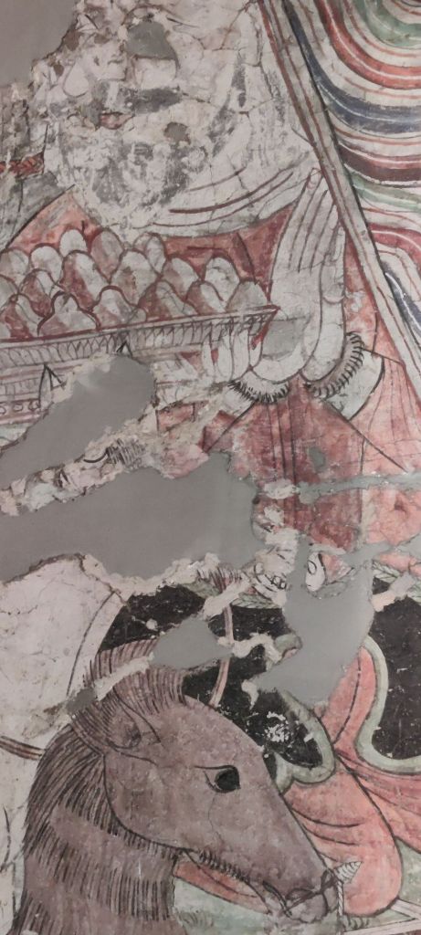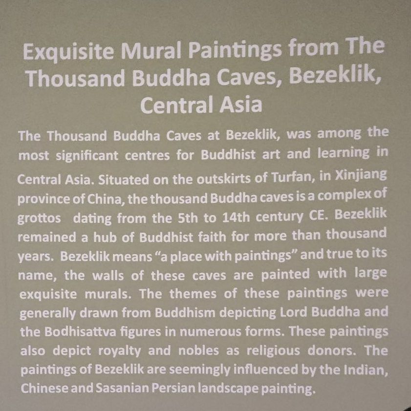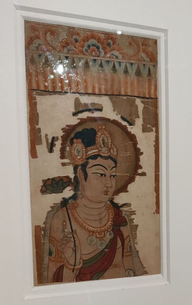 From the Central Asian collection, there are murals from the Mogao Caves (Thousand Buddha Grottoes) in China, which were an important site along the Silk Road. The caves hold a thousand years of Buddhist sculpture and painting, making them a UNESCO World Heritage site. The Library Cave was discovered in 1990 with tens of thousands of manuscripts; most of the silk paintings in this room are from there.
