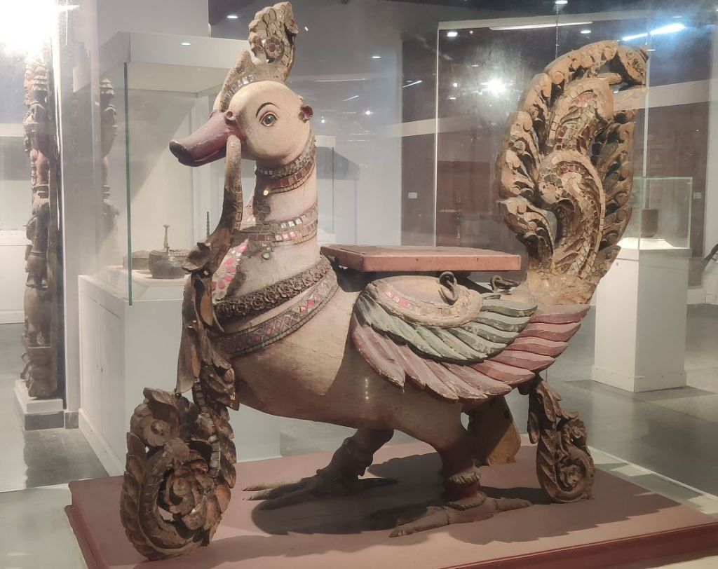 This is a wood and glass peacock, the mount of war god Karttikeya, from the 1800s.
