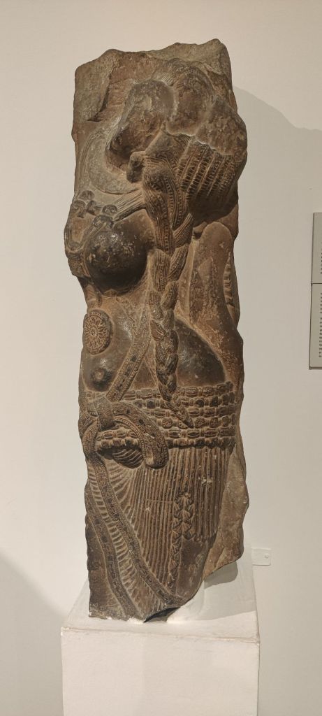 Excuse me while I shamelessly skip centuries of treasures and move to the Kushana Gallery, which includes this sandstone pillar from a Buddhist stupa, carved in the second century. The figure is a tree spirit motif rooted in a pre-Buddhism fertility rite, here incorporated into a stupa’s pillar to bless the site it was built on.