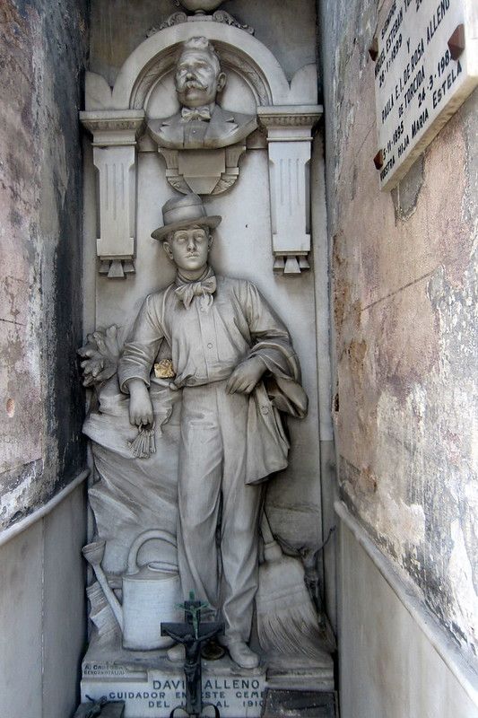 Speaking of work-adjacent entombment, cemetery caretaker David Alleno saved up for years for his own statue and burial. He supposedly killed himself upon the vault’s completion. His statue depicts him with his keys, duster, broom and watering can.